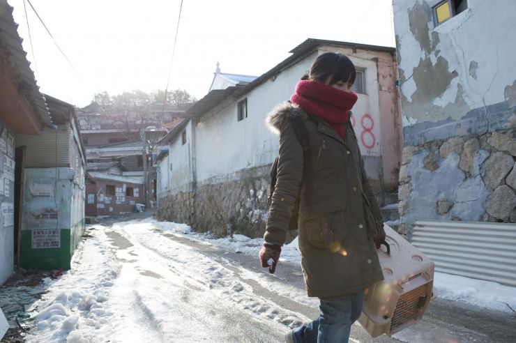 Director Min Yong-geun (민용근) has constructed a a very delicately paced drama, and wonderfully conveys Hye-hwa’s life as lonely and fragile. As she walks through the desolate landscape of abandoned buildings and feral animals, Hye-hwa is actually allegorically exploring the fragments of her consciousness which has never healed following the traumatic loss of her baby. Similarly, her passionate desire to find and treat the sick dogs in the area are the result of Hye-hwa’s inability to cope with her loss, chasing the helpless inside her psychosis as she desperately tries to exert control over the one thing she can never rectify. If all this sounds like an enormous burden, it is; the large red muffler that Hye-hwa wears is symbolic of the enormous strain she ‘wears’ day after day that weighs her down and threatens to engulf her.