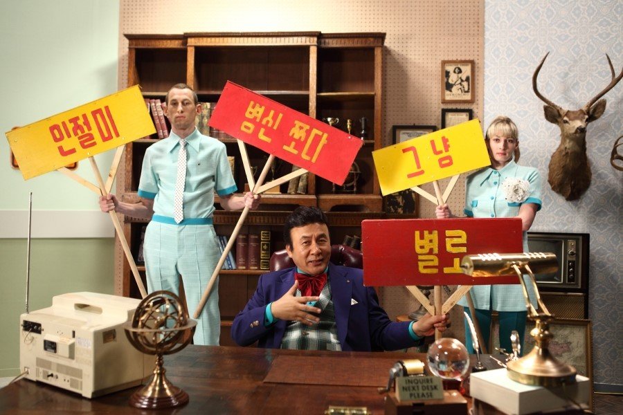 While the story of a woman struggling in both her professional and personal life is nothing new in the rom-com arena, director Lee infuses the film with such a whimsical visual and musical vitality that it’s impossible not to be won over. From the outset the director’s keen sense of mise-en-scene and flamboyantly playful use of text and image techniques are apparent, yet it is the introduction of charismatic Dr. Swalski that allows him to fully display his zany aesthetics. The doctor – brilliantly performed by Park Yeong-gyoo – is a guardian angel of sorts who bestows advice on how to manipulate men through the video. The cheesy and camp sensibilities of such ’70s style infomercials are lovingly recreated to hilarious effect, from the costumes and props through to the mistakes and bad editing. What makes Dr. Swalski special however is that he is not confined to the TV set. Director Lee constantly plays with and breaks the barriers between the three realities – the video, Bo-na’s life, and the audience – which makes the film incredibly charismatic.